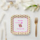 A square shaped birthday plate for a two year old, which co-ordinates with the round version. All items of text can be personalised: Name, caption, greeting. The design features a smiling monkey with a bright pink balloon which has the figure 2 on it. A further pattern of monkeys on a cream background decorates the edge of the plate.
