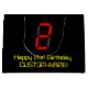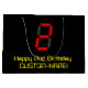 This nerdy and silly birthday themed gift bag design features a large number "2" with a red seven segment digital display style appearance, along with the message "Happy 2nd Birthday," and a personalised name in geeky yellow text, on a black coloured background. A personalised gift bag like this might be used when wrapping presents or gifts being given in honour of somebody’s second birthday. [~Z0000389]