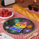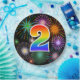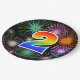 This fun, colourful, and cheerful paper plate design features a large number "2" containing a rainbow spectrum gradient inspired pattern colouring. It also features a exciting and vibrant bursting celebratory fireworks inspired pattern. It has a black coloured background. Paper plates like this might be fun to use at a party being held to celebrate somebody’s second birthday, a 2nd anniversary, or some other 2nd event. [~Z0000490]