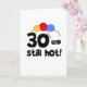 Three balloons and text that reads "30 and still hot!" is featured on 30th birthday cards, T-shirts, mugs, buttons, and more.