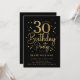 30th birthday party invitation in black and gold. Trendy modern design, perfect for a stylish men's or women's bday celebration. Features script font and confetti. Customize with your own details. Printed Zazzle invitations or instant download digital printable template.