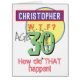 Celebrate a birthday with a personalised card showing name and birthday age. Funny message says "How did THAT happen!". Add your own personal message inside too. 30 years old.
