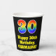 This fun and exciting birthday themed paper cup design features a large number “30” having a rainbow spectrum gradient inspired pattern. It also features the message “Happy 30th Birthday,”, and a customisable name. It also has a black-coloured background. Colourful, vibrant paper cups like this might be fun to use at a birthday celebration/party being held to honour somebody’s 30th birthday. [~Z0000537]