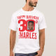Happy 30th Birthday bright red and white text, custom front, and back photo, and name t-shirt. Fun 30th personalised photo in bold red and contrasting white birthday tee design. Personalise this birthday shirt with two photographs of the birthday person in the middle of the number 0 on the front and back ideal for a past and present photo opportunity. Great idea for adding some fun to a milestone thirtieth birthday party, event, wave, or birthday drive by. Other matching items and colours are available. Exclusive design by Sarah Trett for www.mylittleeden.com