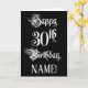 The front of this luxurious and formal birthday-themed greeting card design features the message “Happy 30th Birthday,” in elegant script style text, on a black coloured background. The inside has a personalised birthday greeting message, or could perhaps be cleared and left blank if a message is to be written by hand instead. An ornate, personalised birthday greeting card like this might be a respectable way to deliver birthday greetings to somebody who is celebrating their thirtieth birthday. [~Z0000554]