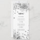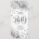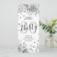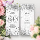 Elegant Glam Silver Floral Glitter 30th Birthday Script template featuring party menu text, flower arrangements, glitter confetti and modern typography script.