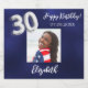 A navy blue background. The blue colour is uneven. Personalise and add a date, name and a photo. Age number written with a faux silver looking balloon style font.