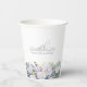 Elegant white rose and blue wildflower floral arrangement decorates the bottom of this 30th birthday party personalised paper cup. 30th is written in a modern script font. The remainder of the text is a spacious serif.