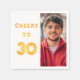 A napkin for a 30th birthday party. Template for your photo. White background and the tex: Cheers to 30. The text is written with a trendy faux gold balloon script.