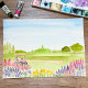 This charming watercolor features a pine-lined golf course and a playful pink golf cart, framed by soft pink astilbe and blooming Russian sage—creating a lighthearted, serene setting perfect for a 30th birthday celebration.