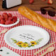 Elegant and classy yellow sunflower, peony and white daisy floral custom paper plates. Three lines of text let you personalise your table decor.