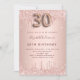 A modern, stylish and glamourous invitation for a 30th birthday party. A faux rose gold metallic looking background with an elegant faux rose gold glitter drip, paint drip look. The name is written with a modern dark rose gold coloured hand lettered style script. Personalise and add your party details. Number 30 is written with a balloon style font, script.