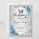 30th Birthday Invitation. Elegant floral design in silver and icy blue. Features faux glitter silver stripes, turquoise roses stylish script font and confetti. Perfect for a glam birthday party.