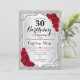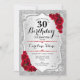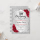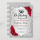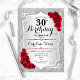 30th Birthday Invitation. Elegant floral design in silver and red. Features faux glitter silver stripes, red roses stylish script font and confetti. Perfect for a glam birthday party.