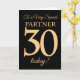 A chic 30th Birthday Card for a 'Very Special Partner', with a number 30 composed of gold-effect numbers and the word 'Partner', in gold-effect, on a black background. The inside message, which you can change if you wish, is 'Happy Birthday'
