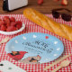 This personalised paper plate makes a cheery accessory for a couple celebrating a 30 year wedding anniversary! A pair of cardinal birds pops up below elegant script text that reads, “30th Anniversary” and two names and a wedding date which can be customised. Hearts form a circular border around the blue sky design.