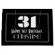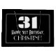 This vintage appearance 1920s-1930s style inspired birthday-themed giftbag design features a large art deco style inspired number "31", the message "Happy 31st Birthday,", a personalised name, and a border pattern consisting of thin lines. It features a black-coloured background. A gift bag like this might be used when giving a gift or present in honour of somebody’s thirty first birthday. [~Z0000495]