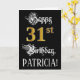 The front of this elegant and luxurious birthday greeting card design features the message “Happy 31st Birthday,”, and a custom recipient name. Part of the message is in a lavish script-style text. The large number “31st” features a faux/imitation gold-inspired look pattern. The background is coloured black. The inside has an editable birthday greeting message, or could perhaps be cleared and left blank if a message is to be written by hand instead. A fancy, customised birthday greeting card like this might be a respectable way to send a birthday greeting message to somebody who is celebrating their thirty-first birthday. [~Z0000559]
