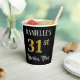 This elegant and ornate birthday paper cup design features a personalized name and the message “31st Birthday Party”. The large number “31st” has an imitation/faux gold-inspired coloring pattern, and the words “Birthday Party” are in luxurious script-style text. The background is colored black by default (although it can be customized). Fancy, opulent paper cups like this might be used at a birthday party/celebration being held to celebrate somebody’s 31st birthday. [~Z0000567]