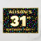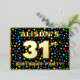 The front of this fun thirty-first birthday party foil invitation card design features a personalised name, a large number “31st”, the message “BIRTHDAY PARTY!”, and a border. The background of the front has an eye-catching, colourful star shapes pattern. The back features personalised details about the event, such as the date, time, venue/place, and any other relevant information. Customisable invitations like these might be a fun way to invite guests to a birthday gathering being held in celebration of somebody’s 31st birthday. [~Z0000600]