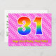 The front of this cheerful, upbeat, and fun birthday themed postcard design features a large number "31" with a rainbow spectrum gradient inspired pattern, along with the message "Happy 31st Birthday,", and a customisable recipient name. The front additionally features a happy dark pink and light pink striped pattern with heart shapes. The back features a custom birthday greeting message, or could perhaps be cleared and left blank if a message is to be written by hand instead. A customisable birthday postcard like this might be a fun way to send a message in celebration of somebody’s thirty first birthday. Postcards like this might also be used to invite guests to a birthday party being held for somebody who is turning 31 years old. [~Z0000449]