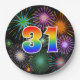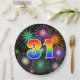 This colourful, cheerful, and fun paper plate design features a large number "31" containing a rainbow spectrum gradient inspired pattern. It also features a vibrant and exciting bursting celebratory fireworks inspired pattern. It has a black coloured background. Fun paper plates like this might be used at a celebration being held in honour of somebody’s thirty first birthday, a thirty first anniversary, or some other thirty first event. [~Z0000490]