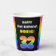 This fun and joyful birthday themed paper cup design features the number “32“ having a vibrant multicolored rainbow spectrum inspired gradient pattern, along with the message “HAPPY 32nd BIRTHDAY,”, and an editable recipient name. Upbeat birthday themed paper cups like this might be used at a party for somebody who is celebrating their thirty second birthday. [~Z0000639]