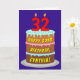 This joyful and upbeat birthday themed greeting card design features a depiction of a three-tier birthday cake having number-shaped candles on top showing the age “32“, along with the message “HAPPY 32ND BIRTHDAY,”, and a personalised recipient name. The inside features a customisable birthday greeting message, or could perhaps be cleared and left blank if a message is to be written by hand instead. A fun, customisable birthday greeting card like this might be used to acknowledge somebody’s thirty-second birthday. [~Z0000620]