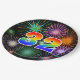 This fun, cheerful, and colourful paper plate design features a large number "32" containing a rainbow spectrum gradient inspired pattern. It also features a exciting and vibrant bursting celebratory fireworks inspired pattern. It has a black coloured background. Paper plates like this might be fun to use at a celebration being held to honour somebody who is celebrating their 32nd birthday, a thirty second anniversary, or some other 32nd event. [~Z0000490]