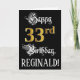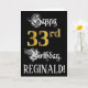 The front of this ornate and lavish birthday themed greeting card design features the message “Happy 33rd Birthday,”, plus a custom recipient name. Part of the message is in a fancy script-style text. The large number “33rd” features a faux/imitation gold-inspired look pattern. The background is coloured black. The inside has a personalised birthday greeting message, or could perhaps be cleared and left blank if a message is to be written by hand instead. A formal, customisable birthday greeting card like this might be sent to celebrate somebody’s thirty-third birthday. [~Z0000559]
