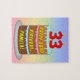 this colourful and cheerful birthday jigsaw puzzle design features a cartoon-style depiction of a three-tier birthday cake having numeral-shaped candles on top showing the number “33“, along with the message “HAPPY 33RD BIRTHDAY,”, and a custom recipient name. The background has a multi-colour pastel rainbow spectrum inspired gradient pattern. A fun, editable birthday puzzle like this might be given in celebration of somebody’s thirty-third birthday. [~Z0000621]