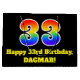 This vibrant and fun birthday gift bag design features a large number "33" with a rainbow spectrum gradient inspired pattern, along with the message "Happy 33rd Birthday,", and a personalised name. It also has a black-coloured background. A colourful gift bag like this might be a fun way of wrapping a birthday present or gift being given to somebody who is celebrating their 33rd birthday. [~Z0000521]