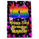 This joyful and colourful birthday themed giftbag design features a large number “33” with a rainbow spectrum gradient inspired pattern, along with the message “Happy 33rd Birthday,”, and a custom name. The background features a pattern of pink, purple, and red heart shapes. A birthday themed gift bag like this might be a fun way to wrap a gift or present being given to celebrate somebody’s thirty third birthday. [~Z0000551]
