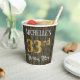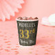 This luxurious and elegant birthday-themed paper cup design features a customisable name and the message “33rd Birthday Party”. The large number “33rd” features an imitation/faux gold-inspired colouring pattern, and the words “Birthday Party” are in ornate script-style text. The background features an imitation/faux woodgrain-inspired appearance. Opulent, fancy paper cups like this might be used at a birthday party/celebration being held to honour somebody’s 33rd birthday. [~Z0000568]
