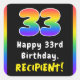 This vibrant and exciting birthday-themed square sticker design features the number “33“ having a colourful rainbow spectrum inspired gradient pattern, along with the message “Happy 33rd Birthday,”, and a custom recipient name. Stickers like these might be given out or used at a party held for somebody who is celebrating their 33rd birthday, or perhaps used when preparing invitations or wrapping gifts for such an event. [~Z0000630]