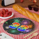 This fun, cheerful, and colourful paper plate design features a large number "33" coloured with a rainbow spectrum gradient inspired pattern. It also features a exciting and vibrant bursting celebratory fireworks inspired pattern. It has a black coloured background. Paper plates like this might be fun to use at a party being held to celebrate somebody’s 33rd birthday, a thirty third anniversary, or some other thirty third event. [~Z0000490]