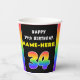 This joyful and upbeat birthday-themed paper cup design features a big number “34“ with a vibrant rainbow spectrum inspired gradient pattern, along with the message “HAPPY 34th BIRTHDAY,”, and a personalised recipient name. Birthday themed paper cups like this might be a fun way to celebrate somebody’s 34th birthday. [~Z0000639]
