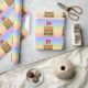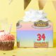 This colourful and joyful birthday wrapping paper design features a cartoon-style depiction of a three-tier birthday cake having number-shaped candles on top showing the age “34“, along with the message “HAPPY 34TH BIRTHDAY,”, and a custom recipient name. The background features a multi-colour pastel rainbow spectrum inspired gradient pattern. Fun wrapping paper like this might be used when giving a gift or present in honour of somebody’s thirty fourth birthday. [~Z0000622]