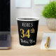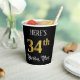 This opulent and ornate birthday-themed paper cup design features a personalized name and the message “34th Birthday Party”. The large number “34th” has a faux/imitation gold-inspired coloring pattern, and the words “Birthday Party” are in elegant script-style text. The background is colored black by default (although it can be customized). Fancy, elegant paper cups like this might be useful at a birthday party/celebration being held in celebration of somebody’s 34th birthday. [~Z0000567]