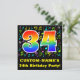 The front of this fun, colourful, and exciting birthday party invitation design features a large number "34" having a rainbow spectrum gradient inspired pattern. It also features an editable name and the message "34th Birthday Party!". Part of the background has a fun pattern of various music notes and symbols having a variety of colours and sizes. The back features customised details about the event that the potential guests are being invited to. Happy, personalised birthday celebration invitation cards like this might be sent to potential guests of a party being held to celebrate a song composer’s, a musician’s, a singer’s, or somebody else’s thirty fourth birthday. [~Z0000427]
