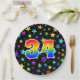 This colourful, fun, and cheerful paper plate design features a large number "34" having a rainbow spectrum gradient inspired pattern colouring. The background features a pattern of colourful star shapes. Fun paper plates like this might be used at somebody’s thirty fourth birthday party, or a couple’s thirty fourth anniversary celebration, or some other thirty fourth event. [~Z0000493]