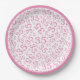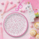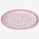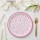 This cool design is a pink and white random number pattern with the milestone number 35 repeated in varied sizes and angles. The design is trimmed with a pink ring around the rim.