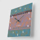The modern, original graphic design by HomeWare on this Square Wall Clock was made from a scan of a piece of 35mm film. The film strip has become a pattern of muted blues and terracotta, with the part of the strip at the top becoming an iridescent rust colour, with blue highlights. The background colour pattern is made up of muted aqua blues and olive browns. In the centre of the design there is white text which reads "studio". This is set to personalise, use as is, or delete.