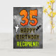 The front of this spooky and scary Hallowe’en themed birthday greeting card design features a large number “35” and the message “HAPPY BIRTHDAY,”, plus a custom name. There are also depictions of a bat and a ghost on the front. The inside features a customised birthday greeting message, or could perhaps be cleared and left blank if a message is to be written by hand instead. A customisable birthday card like this might be a fun way to send a message in celebration of somebody’s thirty fifth birthday that also falls on Halloween (October 31st). [~Z0000547]
