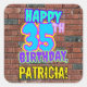This fun birthday themed square sticker design features the message “HAPPY 35TH BIRTHDAY,” having a vibrant, colourful, graffiti and urban street art inspired look, in addition to a customisable recipient name. The background features a pattern inspired by the look of a brick wall. Vibrant, fun, personalised stickers like this might be given as a birthday present, or used while wrapping gifts/presents, or perhaps used as a birthday party decoration when celebrating somebody’s thirty fifth birthday. [~Z0000535]