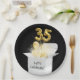 Gold balloons with sparkles and ribbons in a white box on black background for 35th birthday party.