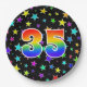 This fun, cheerful, and colourful paper plate design features a large number "35" coloured with a rainbow spectrum gradient inspired pattern. The background features a colourful star shapes pattern. Fun paper plates like this might be used at somebody’s thirty fifth birthday party, or a couple’s thirty fifth anniversary celebration, or some other 35th event. [~Z0000493]