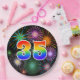 This cheerful, fun, and colourful paper plate design features a large number "35" coloured with a rainbow spectrum gradient inspired pattern. It also features a vibrant and exciting bursting celebratory fireworks inspired pattern. It has a black coloured background. Fun paper plates like this might be used at somebody’s thirty fifth birthday party, a 35th anniversary celebration, or some other 35th event. [~Z0000490]