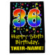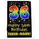 This vibrant, colourful, and exciting birthday themed gift bag design features a large number "36" with a rainbow spectrum gradient inspired pattern, along with the message "Happy 36th Birthday,", and a custom recipient name. It also has a background pattern featuring star shapes of various sizes and colours. A fun giftbag like this might be used when wrapping presents being given to somebody in celebration of their 36th birthday. [~Z0000510]
