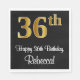 This luxurious, elegant, and sophisticated birthday themed paper napkin design features a large ordinal number “36th” having an imitation/faux gold-inspired appearance, plus the birthday greeting message “Happy 36th Birthday,” and an editable name in a script-style font. The background is coloured black. Luxurious paper napkins like this might be used when hosting a birthday party for somebody in celebration of their thirty sixth birthday. [~Z0000516]